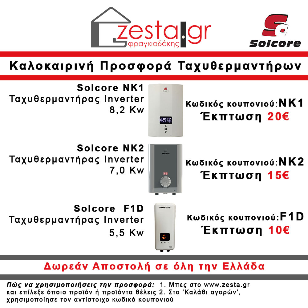 Τριπλή καλοκαιρινή προσφορά μόνο από το Zesta.gr στους ταχυθερμαντήρες Inverter της Solcore: Εκπτωτικά κουπόνια, δωρεάν μεταφορικά και δυνατότητα πληρωμής σε 12 άτοκες δόσεις.